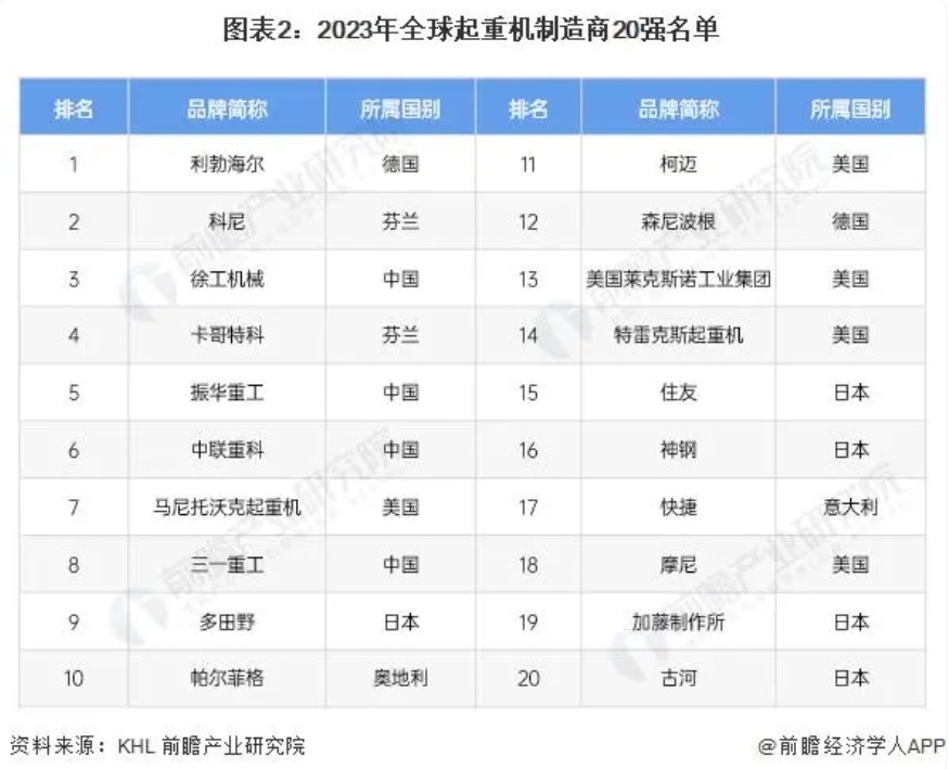 根據(jù)英國KHL集團發(fā)布的2023年全球最大起重機制造商20強排行榜,德國的利勃海爾位居第一,其次是芬蘭的科尼、中國的徐工機械,整體來看,歐美品牌在全球起重機制造市場占據(jù)領先地位。