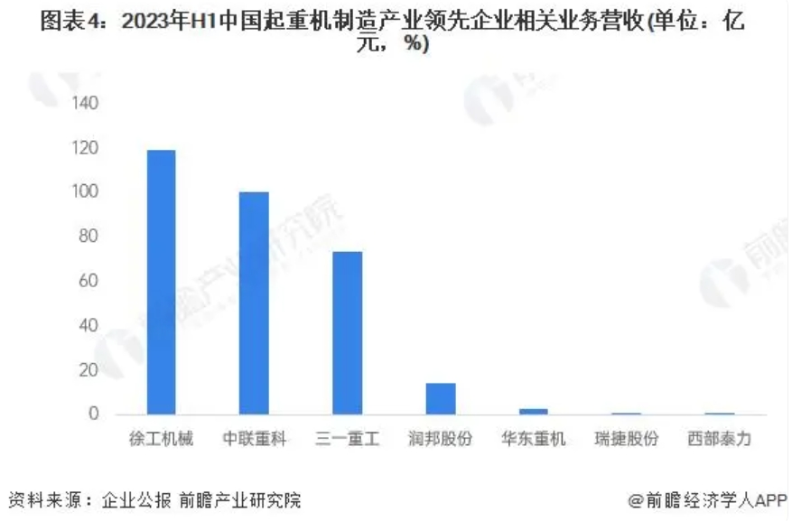 從國內(nèi)領先起重機企業(yè)經(jīng)營規(guī)模來看,2023年上半年,徐工機械、中聯(lián)重科兩家企業(yè)的起重機業(yè)務營收均超過百億規(guī)模,其次是三一重工的相關業(yè)務營收超過70億元,與其它企業(yè)拉開較大差距。